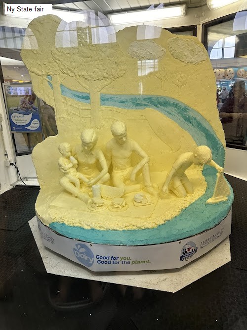 5 /5 Adam Segal-Isaacson: While Saturday was rainy, the fair exhibits were interesting. The several piglets, some just recently born, were intetesting but we were disappointed that there were no llamas in the "goat, llama, and swine" barn. The horse carriage driving competition turned out to be quite interesting although i still have little idea about what was being judged. The dinosaur exhibit was surprisingly good, and interesting that a lot of less commonly known dinosaurs were included. The butter sculpture was bizarre. The idea that one would sculpt someting out of butter is strange to begin with but this one was curious, depicting a White family at the beach and a Black farmer. I realize that butter sculpture has become de rigeur at state fairs since i first heard about it decades ago. My partner said that instead of making a butter sculpture they should donate the butter to people who could use it.
